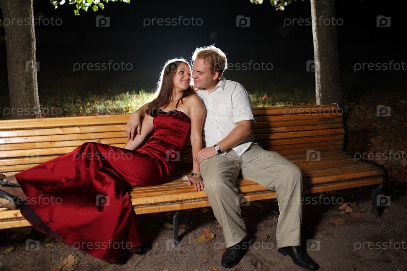 Молодая влюбленная пара, сидящая на скамейке в ночном парке