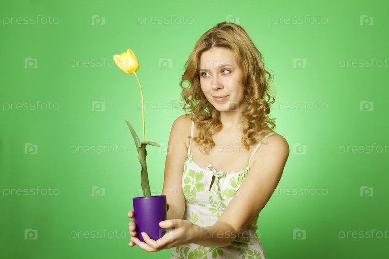 Молодая женщина с желтым тюльпаном на зеленом фоне