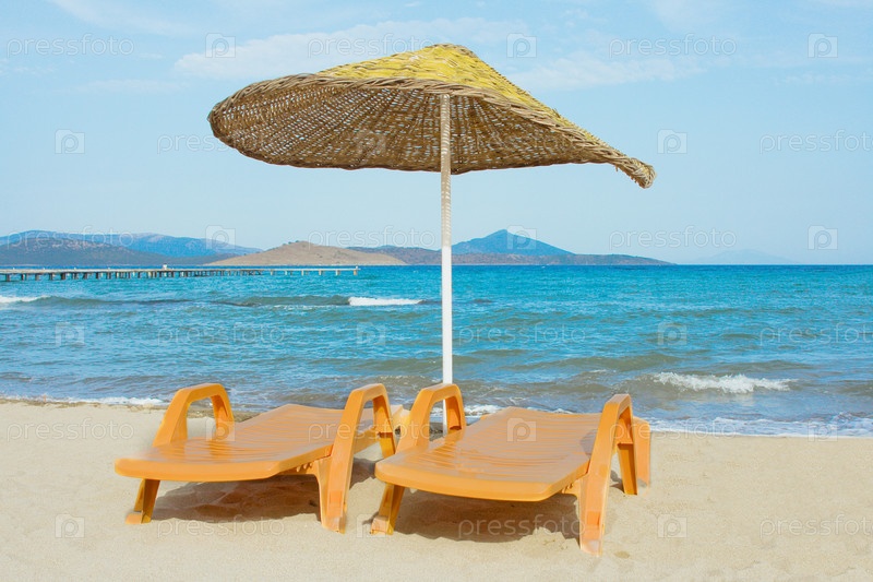 Зонтик и шезлонги на пляже