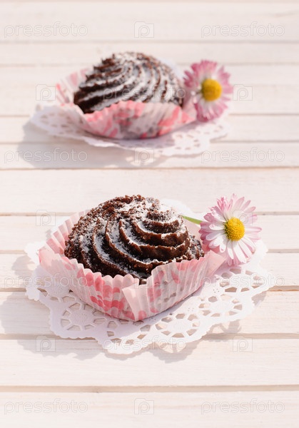 Шоколадное пирожное на столе, на свежем воздухе