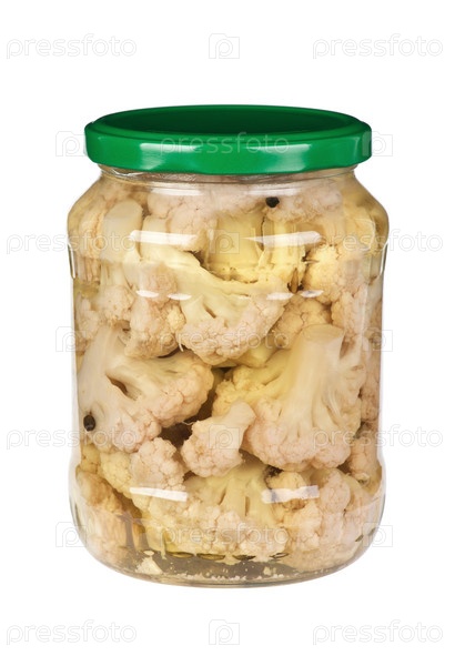 Стеклянная банка с маринованными кусочками цветной капусты на белом фоне