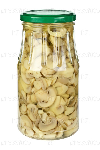 Стеклянная банка с нарезанными маринованными шампиньонами на белом фоне