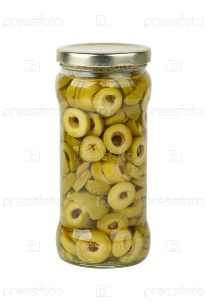 Стеклянная банка с нарезанными зелеными оливками на белом фоне