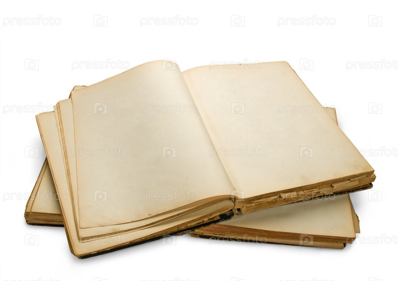 Открытая древняя книга с пустыми страницами, изолированная на белом фоне