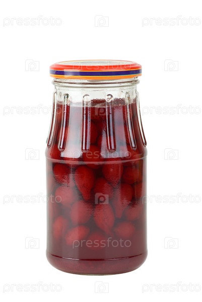 Стеклянная банка с кизиловым вареньем на белом фоне