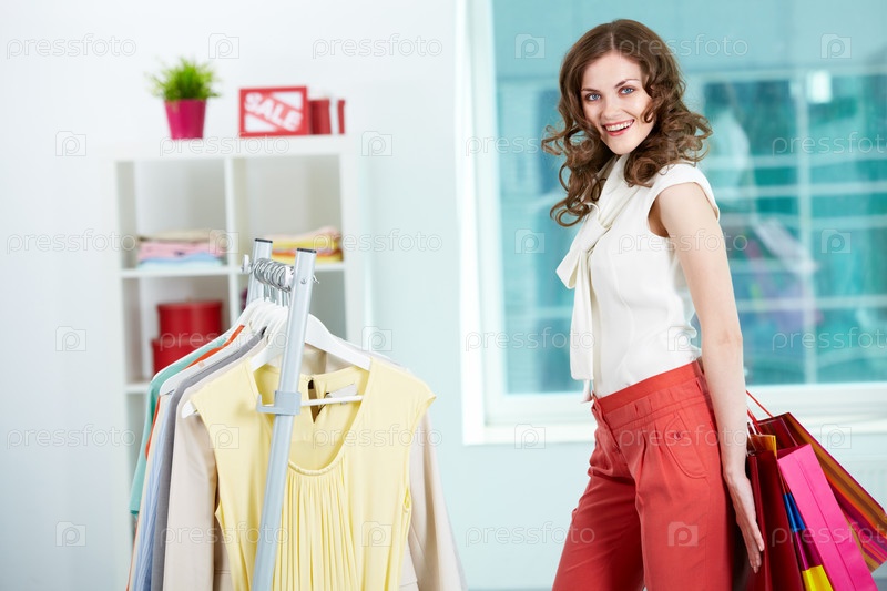 Счастливая покупательница в магазине одежды