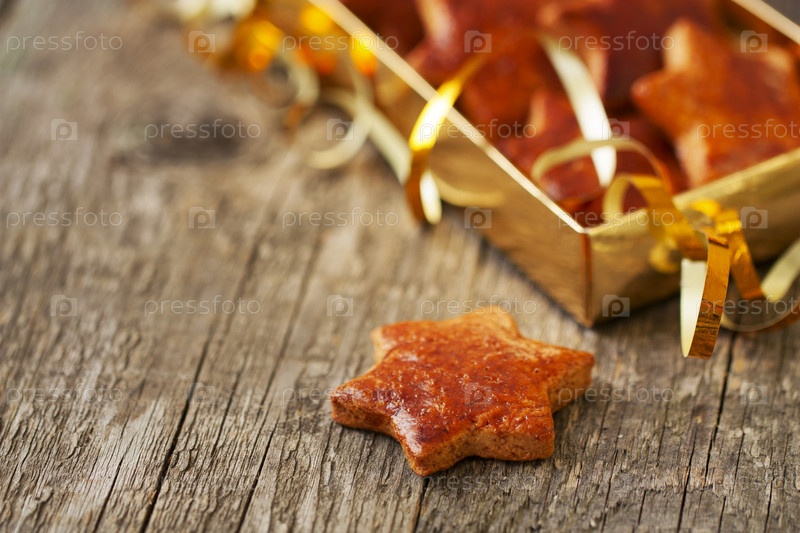 Рождественское имбирное печенье в форме звезд в золотой коробке