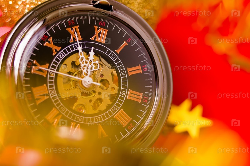 Рождественская открытка. Старинные часы на красном фоне с золотым декором