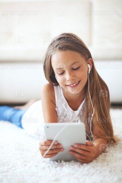 Девочка в наушниках с планшетом