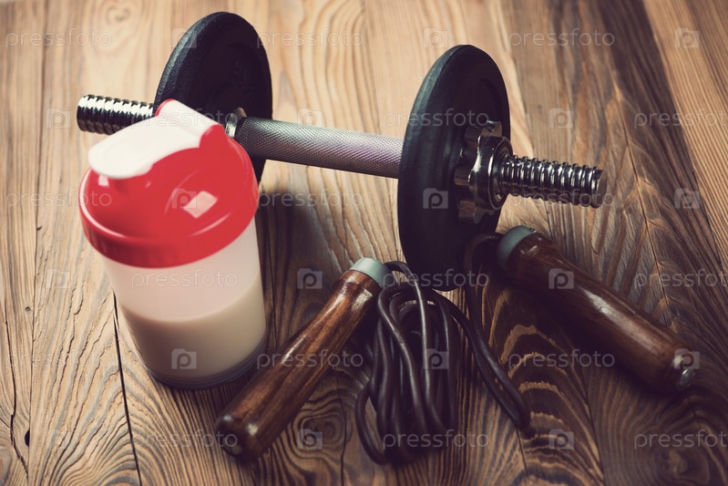 Белковый коктейль, скакалка и гантель