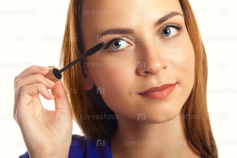 Молодая женщина красит ресницы тушью на белом фоне
