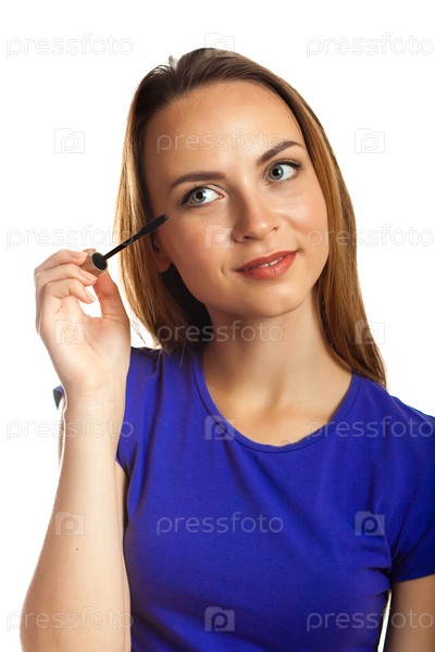 Молодая женщина красит ресницы тушью на белом фоне