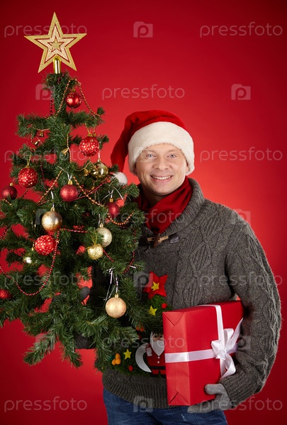 Мужчина в колпаке Санты с подарками