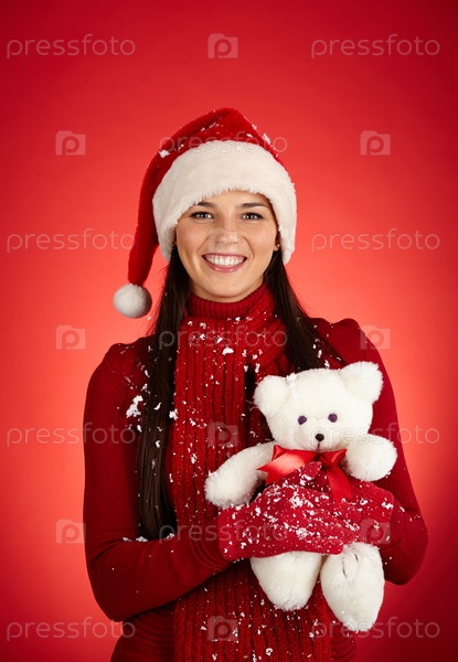 Молодая женщина в колпаке Санты с игрушкой