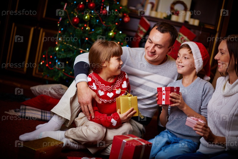 Семья открывает подарки под елкой