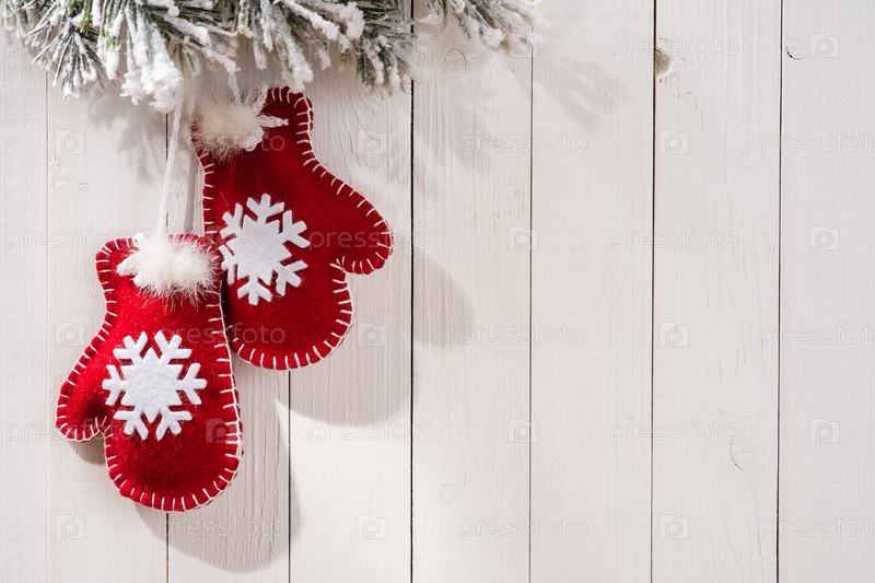 Новогоднее украшение в виде варежки на фоне древесины и место для текста