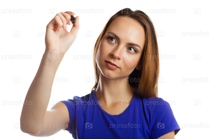 Молодая женщина что-то пишет на белом фоне