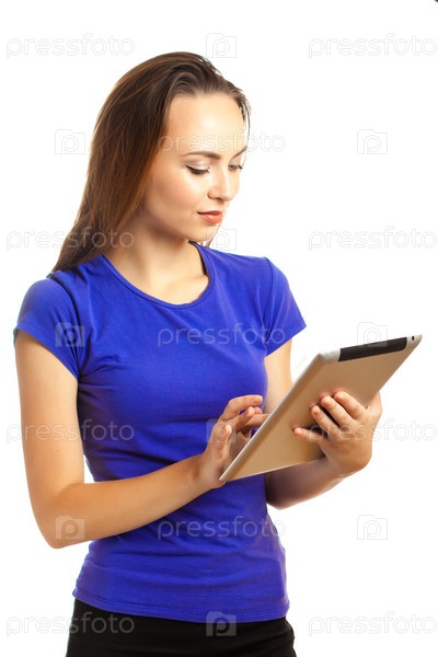 Женщина с планшетом на белом фоне