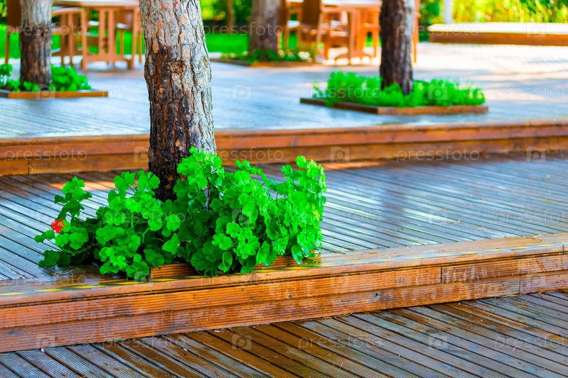 Деревянные полы и ухоженные деревья в парке