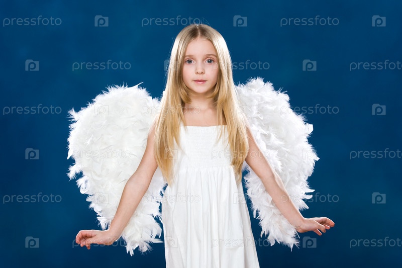 Портрет счастливого ангела в белой одежде и крыльях на синем фоне