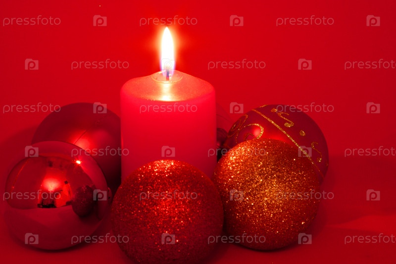 Рождественская открытка со свечой и елочными шарами
