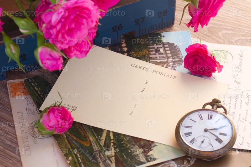 Старая открытка и антикварные часы