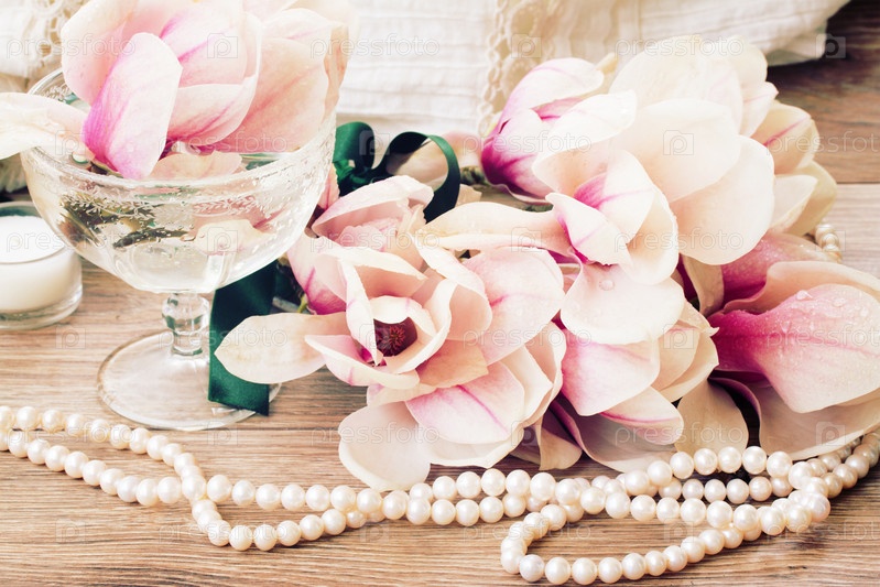 Магнолия с жемчугом на деревянном столе