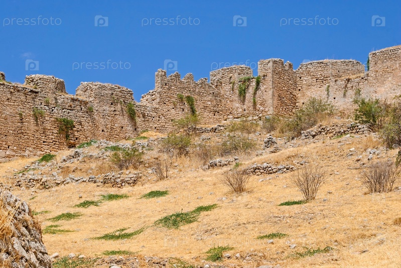 Древний город Коринф, окруженный руинами крепостной стены в яркий солнечный день. Пелопоннес, Греция