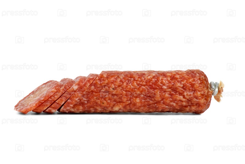 Нарезанная колбаса салями на белом фоне