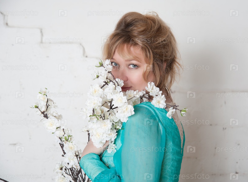 Красивая женщина с веткой цветущего дерева