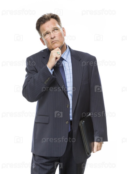 Бизнесмен с рукой на подбородке смотрит вверх