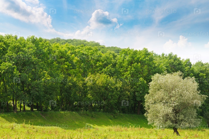 Лес, зеленый луг и голубое небо
