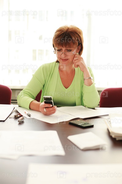 Деловая женщина с мобильным телефоном за рабочим столом