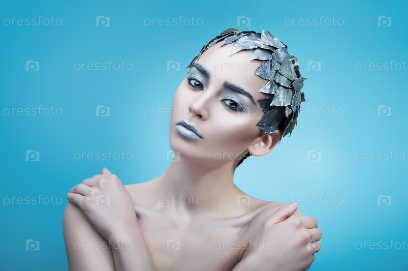 Женщина с ярким макияжем и серебряными листьями на голове