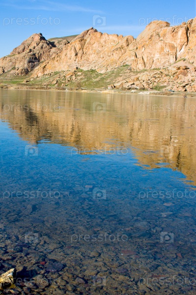 Пейзаж с рекой, скалистыми берегами и голубым небом