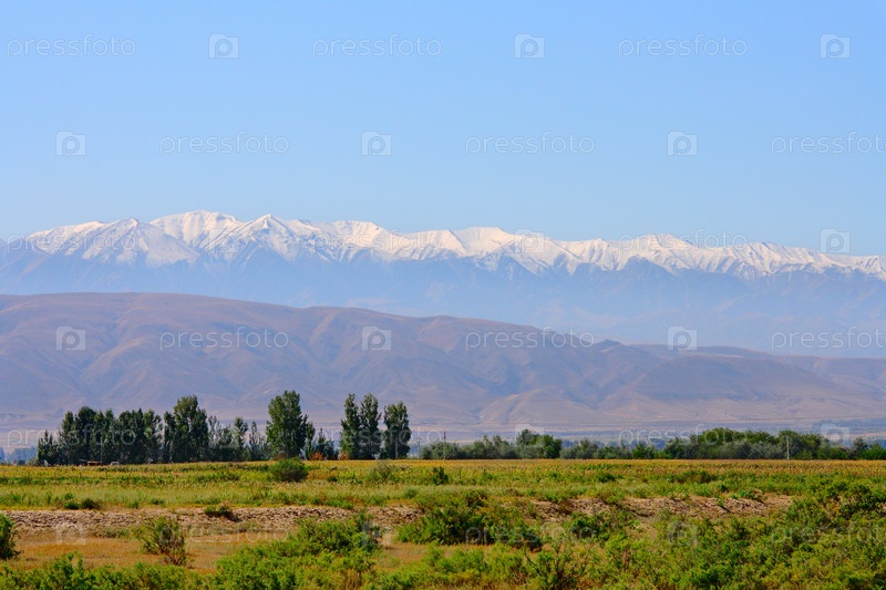 Долина с деревенскими домами и горы, покрытые снегом на горизонте