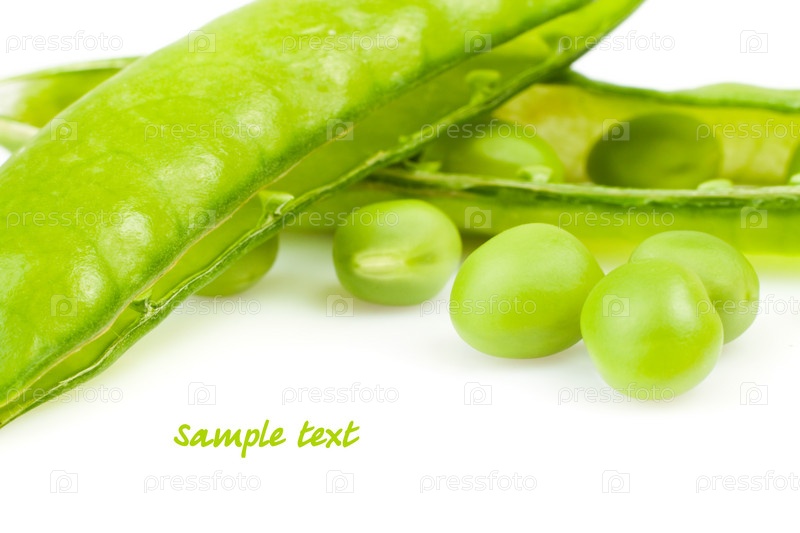 Спелый зеленый горошек в стручке крупным планом на белом фоне