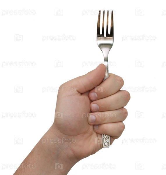 Рука с вилкой на белом фоне