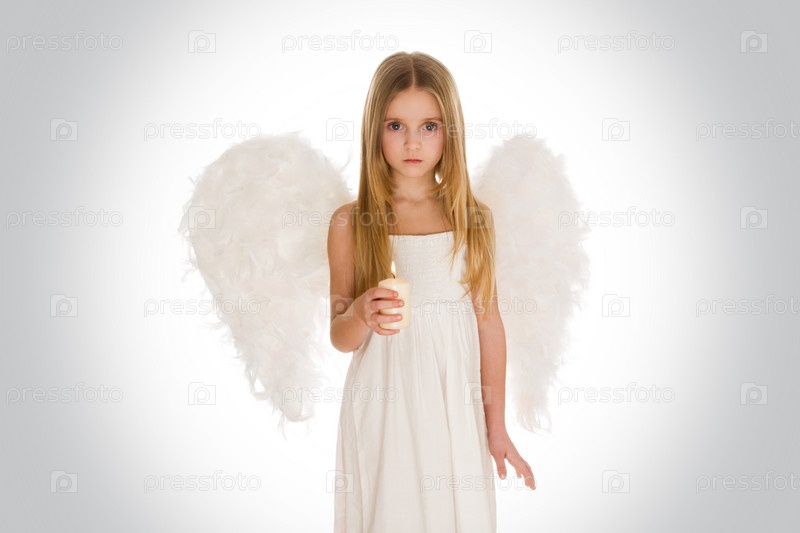 Портрет невинной девушки со свечой и крыльями, окруженной святым светом, глядящей в камеру