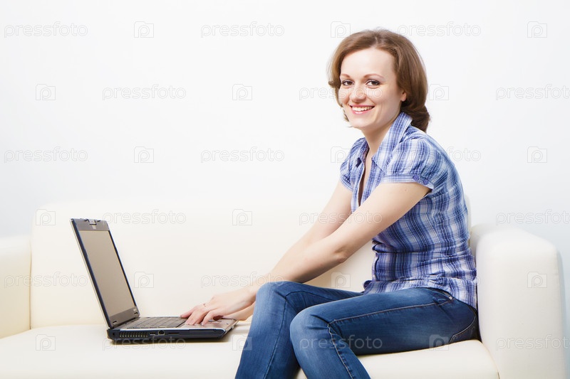 Молодая женщина с ноутбуком на диване