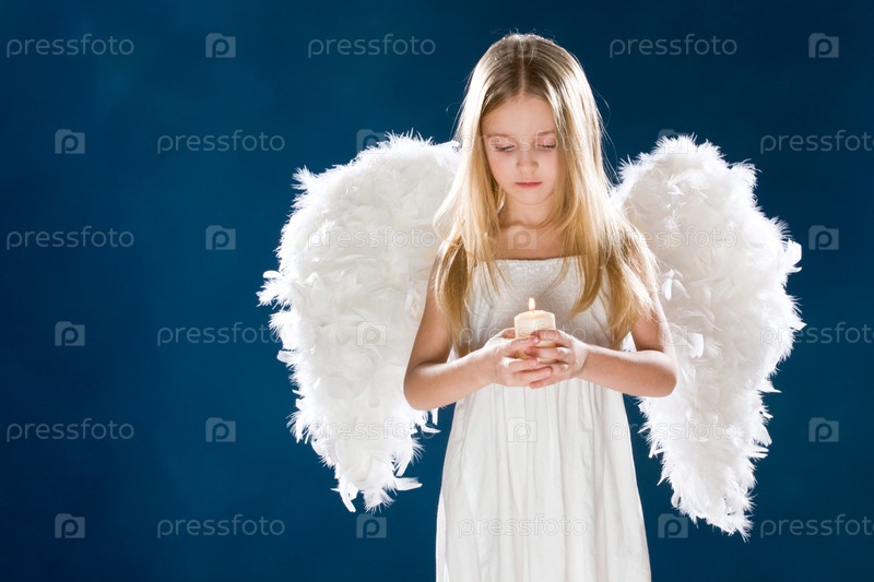 Портрет мирной девушки с белыми крыльями, смотрящей на свечу в руках над голубым фоном