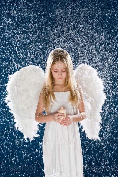 Портрет спокойной девушки, одетой в ангелские крылья и держащей свечу во время сильного снегопада