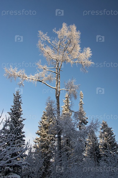 Одинокая осина в зимнем лесу, Южный Урал, Россия