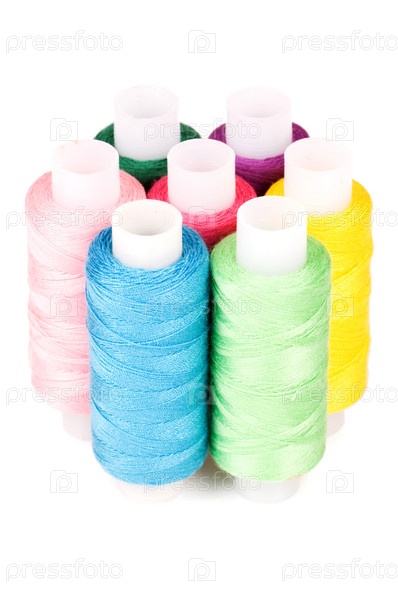 Катушки цветных ниток на белом фоне