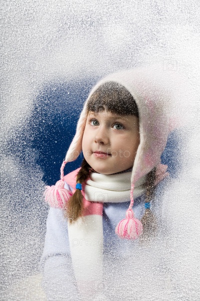 Фото красивой маленькой девочки за замороженным окном, глядящей сквозь него