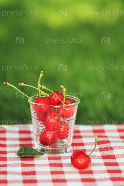 Спелые вишни в стакане. Пикник в саду