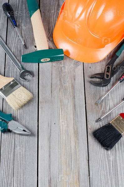 Набор строительных инструментов и защитная каска на деревянной поверхности