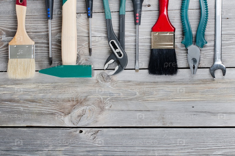 Набор строительных инструментов на деревянной поверхности