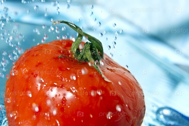 Спелый томат в каплях воды на голубом фоне