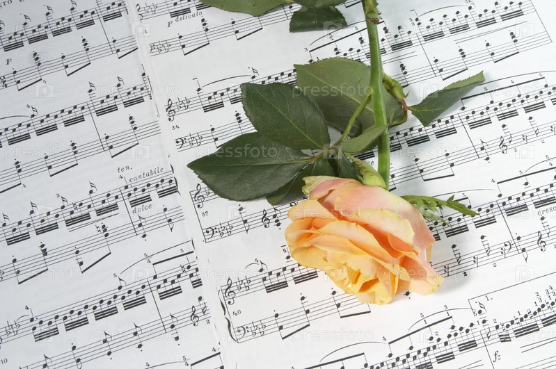 Красивая желтая роза на музыкальных нотах